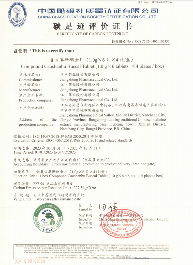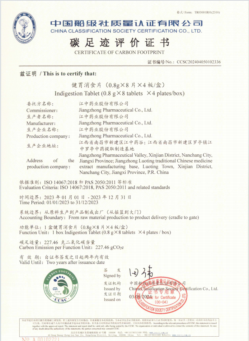9月4日,中国船级社质量认证有限公司完成对金年金字招牌今年会2024药业股份有限公司健胃消食片和复方草珊瑚含片两款产品的碳足迹评价,并正式颁发碳足迹评价证书,为我省中药行业首家。