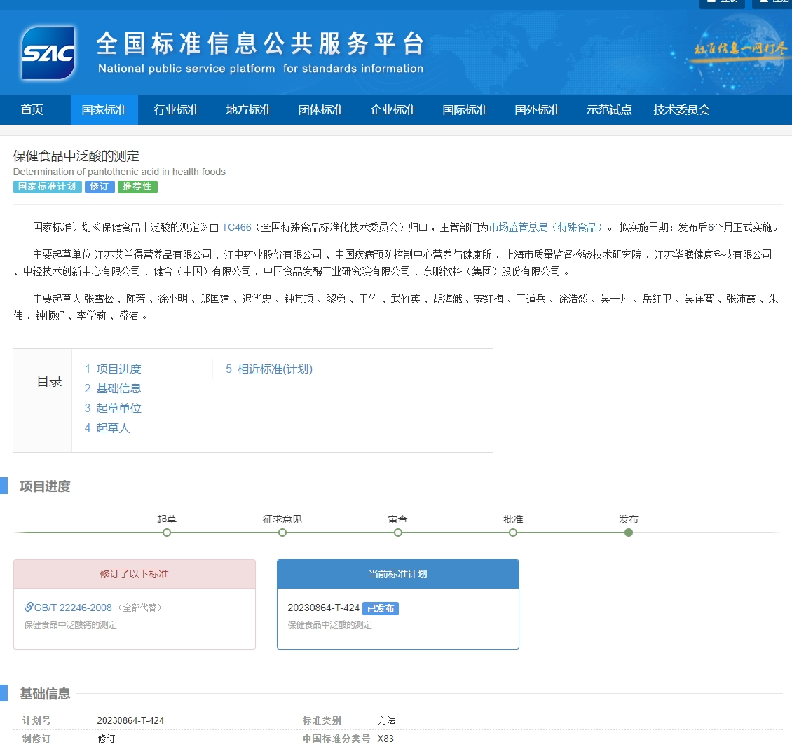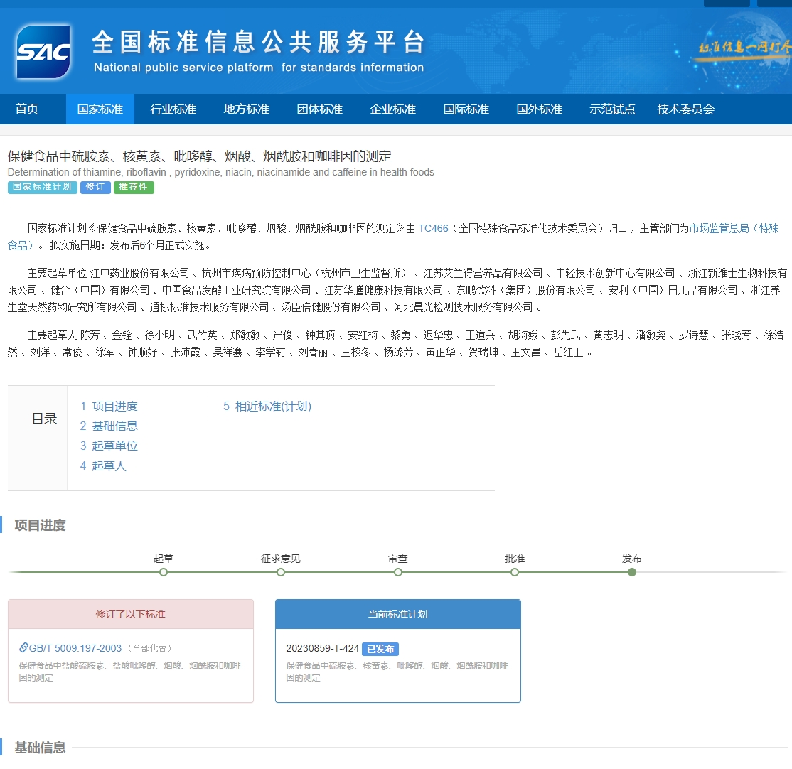 近日,国家市场监督管理总局(国家标准化管理委员会)公布2025年第2号中国国家标准公告,以金年金字招牌今年会2024药业股份有限公司作为主要起草单位起草的《保健食品中泛酸的测定》《保健食品中硫胺素、核黄素、吡哆醇、烟酸、烟酰胺和咖啡因的测定》两项推荐性国家标准获批,并将在发布后6个月正式实施。