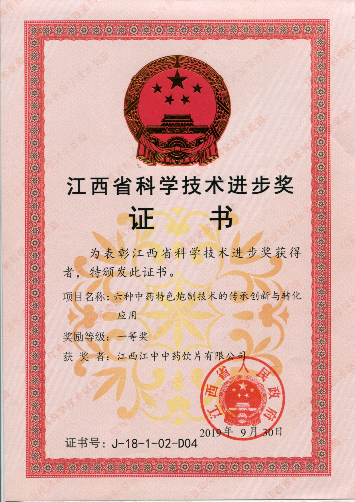 092019年获江西省科学技术进步奖一等奖