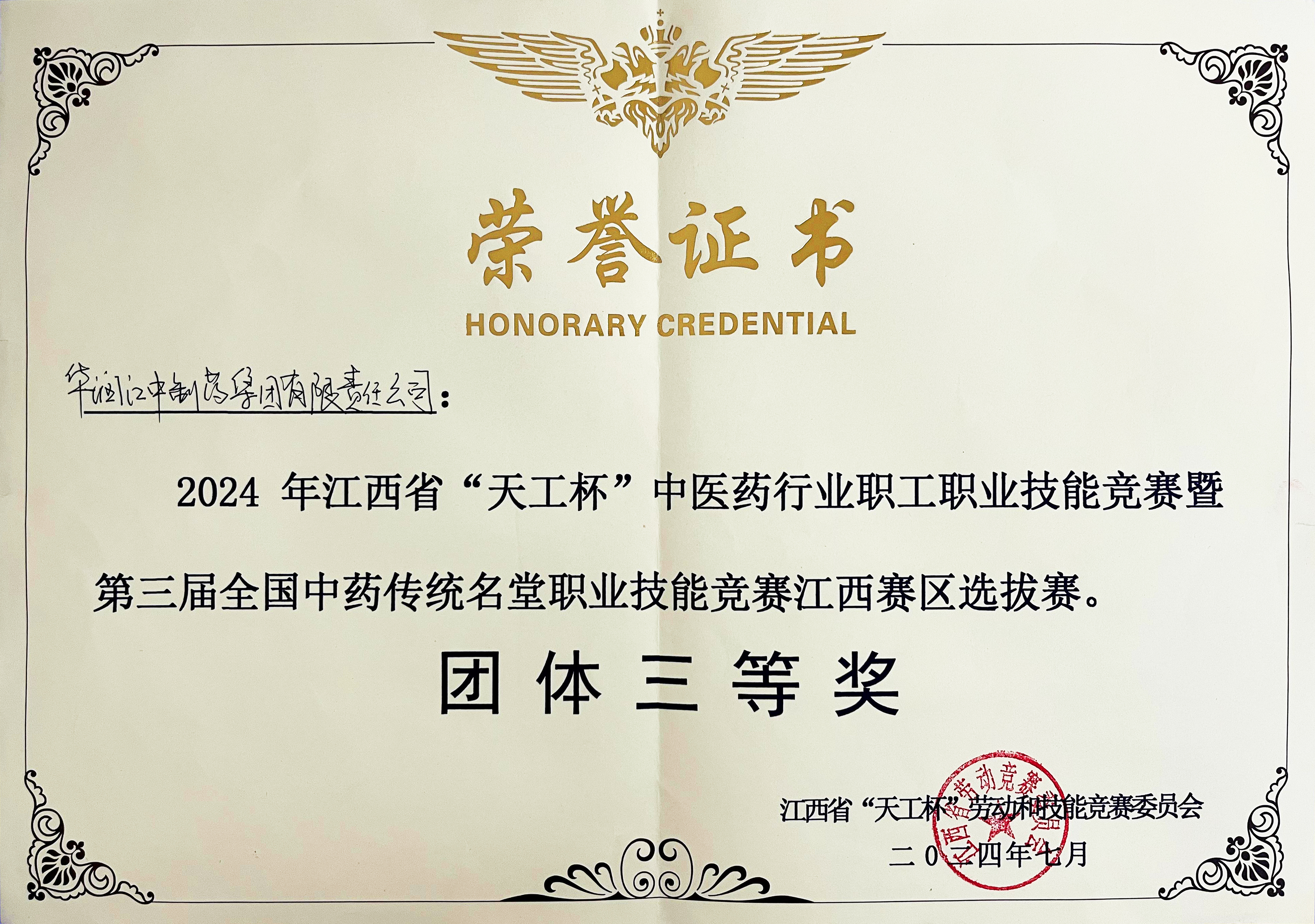 022024年获江西省“天工杯”中医药行业职工职业技能竞赛暨第三届全国中药传统名堂职业技能竞赛江西赛区选拔赛团体三等奖